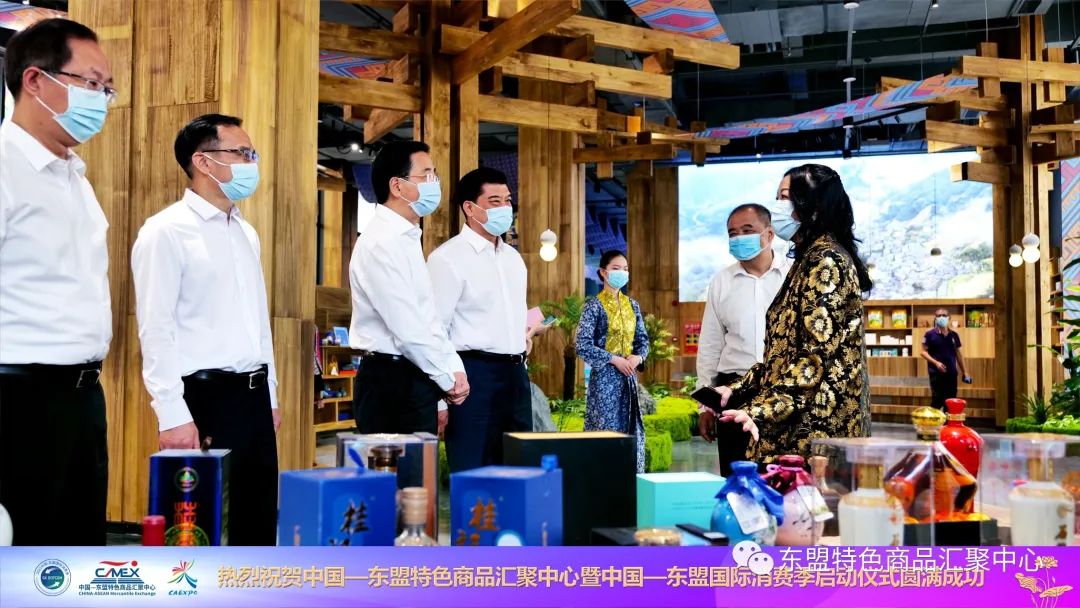 啟動儀式結(jié)束后,張曉欽等自治區(qū)及南寧市領(lǐng)導、東盟各總領(lǐng)事、企業(yè)代表等一同參觀了中國—東盟特色商品匯聚中心展館,對匯聚中心的創(chuàng)新理念給予充分地肯定。在設計藝術(shù)上,展館不僅突顯各個東盟國家獨具匠心的人文風情和建筑風格;在商品展示中,還陳列了各式各樣別具特色的RCEP國家特色商品,如廣西的網(wǎng)紅“螺螄粉”;東盟國家的咖啡、燕窩、芒果干等產(chǎn)品;巴基斯坦的工藝品;健康養(yǎng)生的清真食品等,讓人賞心悅目,味覺大開,給來賓帶來沉浸式的貿(mào)易體驗,觸動了現(xiàn)場嘉賓消費的熱情,更讓現(xiàn)場參觀的商家贊不絕口,對入駐匯聚中心表示極大的熱情。
